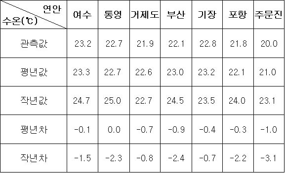 o 작년에 비해 오늘 수온은 여수~부산 1~2.5도 낮게, 기장~포항