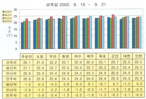 o 최근(2002. 9.17 ∼ 9.23)의 한반도 연안 표면수온은 동해 연안역에서 섭씨