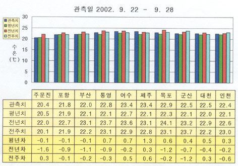 섭씨 20∼22도, 남해 연안역에서 22∼23도, 서해 연안역에서 22∼23도
