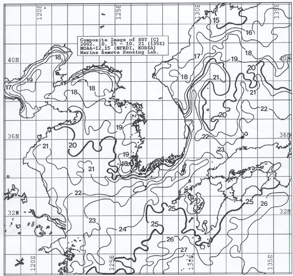 o 아래 그림은 2002년 10월 15일부터 21일 까지 합성한 위성추정 표면 수온 분포도입니다. o 대화퇴 근해 표면수온은 섭씨18∼19도, 울릉도 근해 19∼20도, 대마도 22∼23도, 제주도 근해 22∼23도, 이어도 근해 23∼24도, 일향초 근해 19∼20도, 어청도 근해 18∼20도 내외입니다. o「평년에 비해」수온은 대화퇴 근해 0.5도 높게, 울릉도 0.5도 낮게, 대마도 근해 비슷하게, 제주도 근해 0.5도 높게, 이어도 근해 1도 높게, 일향초 및 어청도 근해에서는 0.5도 높게 나타납니다. o 수온전선대는 제주해협 및 주문진∼울릉도 근해에서 수온 21도를 중심으로 나타납니다. < 위의 그림을 클릭하시면 확대된 수온정보를 보실 수 있습니다 >