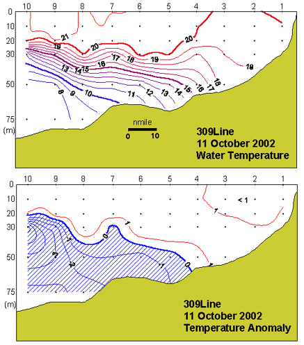 309선(군산 서방)의 수직수온분포도 및 평년편차도 입니다.