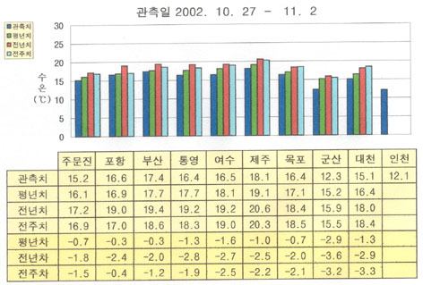 o 최근(2002. 10.27 ∼11.2)의 한반도 연안 표면수온은 동해 연안역에서