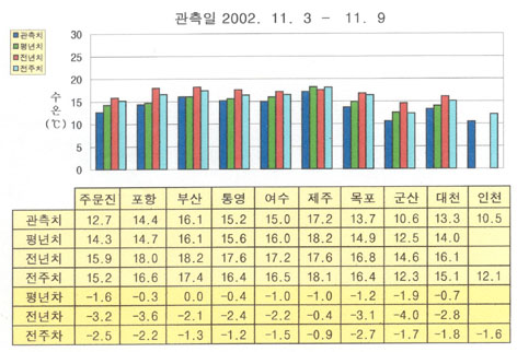 o 최근(2002. 11.3 ∼ 11.9)의 한반도 연안 표면수온은 동해 연안역에서