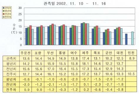 최근(2002. 11.10 ∼ 11.16)의 한반도 연안 표면수온은 동해 연안역에서 섭씨 13∼14도, 남해 연안역에서 14∼17도, 서해 연안역에서 8∼13도 내외로 나타납니다.