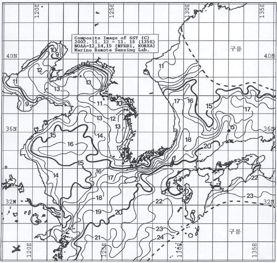 o 수온전선대는 수온 18도를 중심으로 제주도∼대마도 연근해역 및 수온