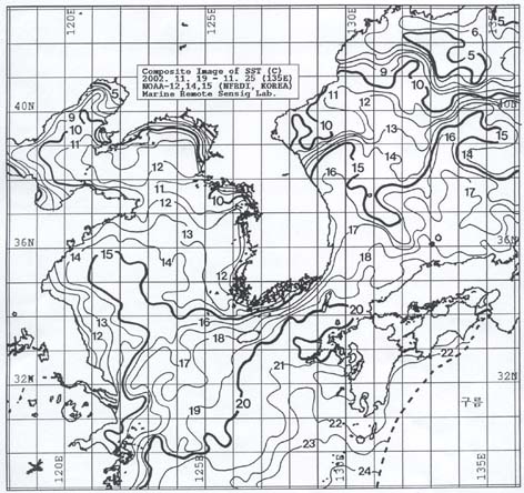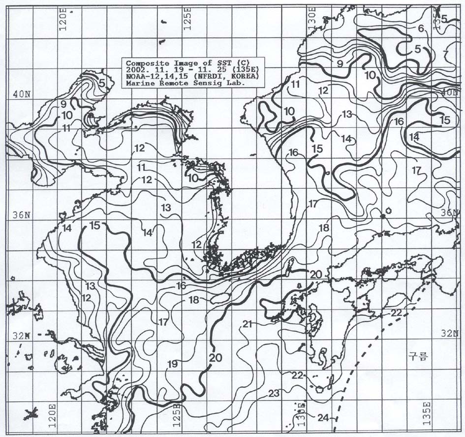 o 아래 그림은 2002년 11월 19일부터 11월 25일 까지 합성한 위성추정 표면 수온 분포도입니다. o 대화퇴 근해 13∼15도, 울릉도 근해 14∼15도, 대마도 19∼20도, 제주도 근해 18∼19도, 이어도 근해 18∼19도, 일향초 근해 15∼16도, 어청도 근해 12∼13도 내외로 나타납니다. o「평년에 비해」수온은 대화퇴 근해 1도 높게, 울릉도 근해 1도 낮게, 대마도 근해 비슷하게, 제주도 근해 1도 낮게, 이어도 근해 0.5도 낮게, 일향초 근해 0.5도 높게, 어청도 근해에서는 1도 낮게 나타납니다. o 수온전선대는 수온 18도를 중심으로 제주도∼대마도 연근해역 및 수온 15도를 중심으로 울릉도∼대화퇴 연근해역에서 형성됩니다. < 위의 그림을 클릭하시면 확대된 수온정보를 보실 수 있습니다 >