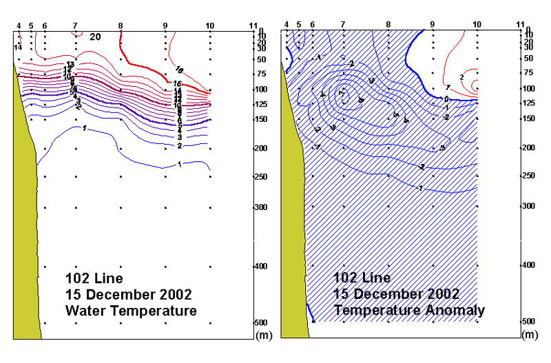 102선(포항 동방)의 수직수온분포도 및 평년편차도 입니다.