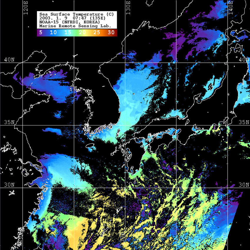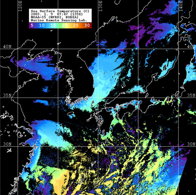 o 2003년 1월 9일 07시 48분 NOAA-15호 위성영상입니다. o 수온분포는 범례를 참고하시기 바랍니다. o 검은색은 구름과 육지를 나타냅니다.