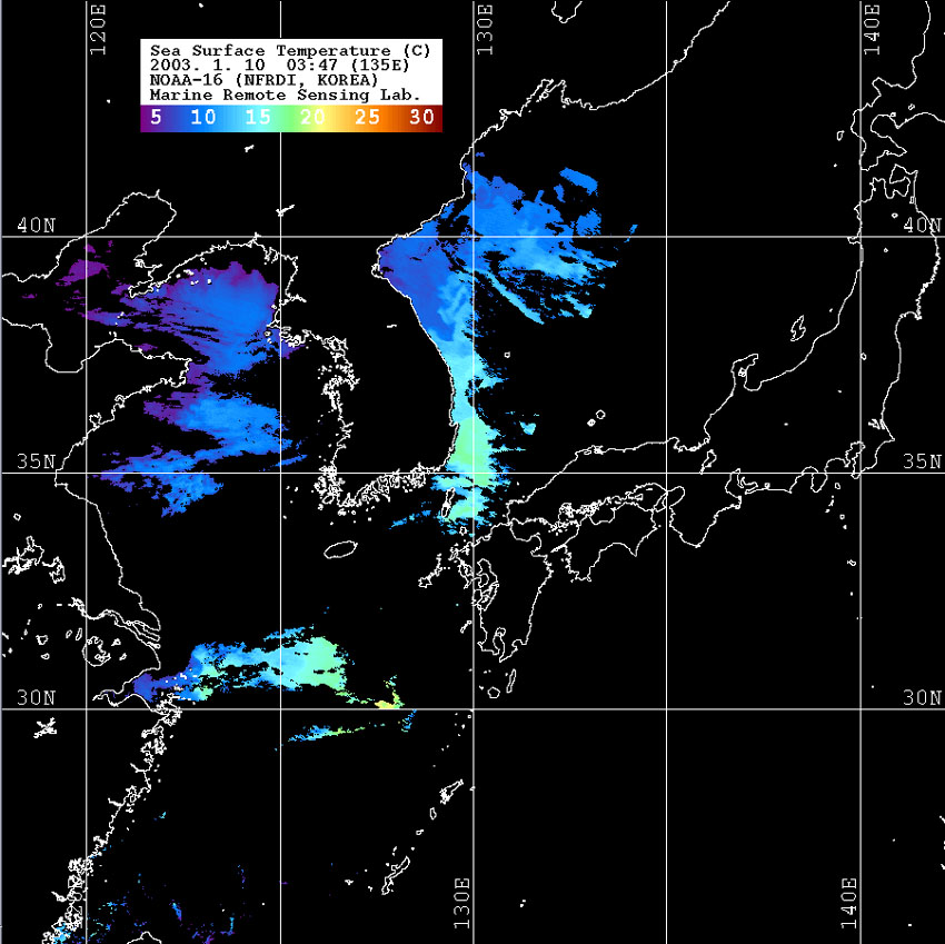 o 2003년 1월 10일 03시 47분 NOAA-16호 위성영상입니다. o 수온분포는 범례를 참고하시기 바랍니다. o 검은색은 구름과 육지를 나타냅니다.
