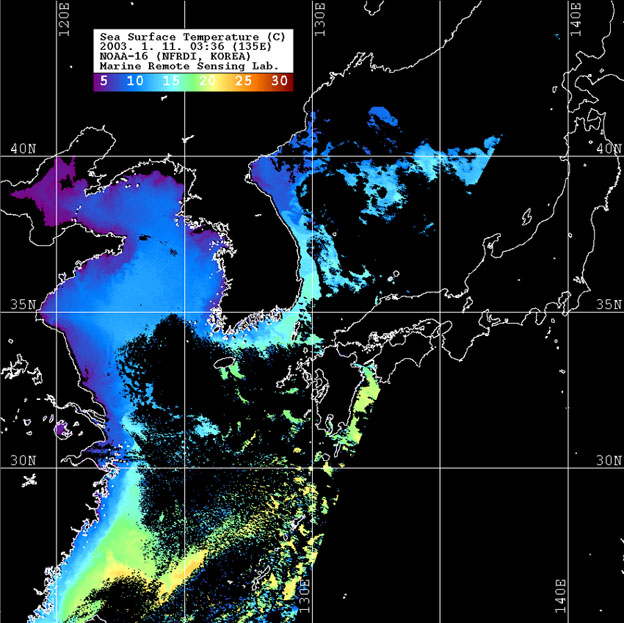 o 2003년 1월 11일 03시 36분 NOAA-16호 위성영상입니다. o 수온분포는 범례를 참고하시기 바랍니다. o 검은색은 구름과 육지를 나타냅니다.
