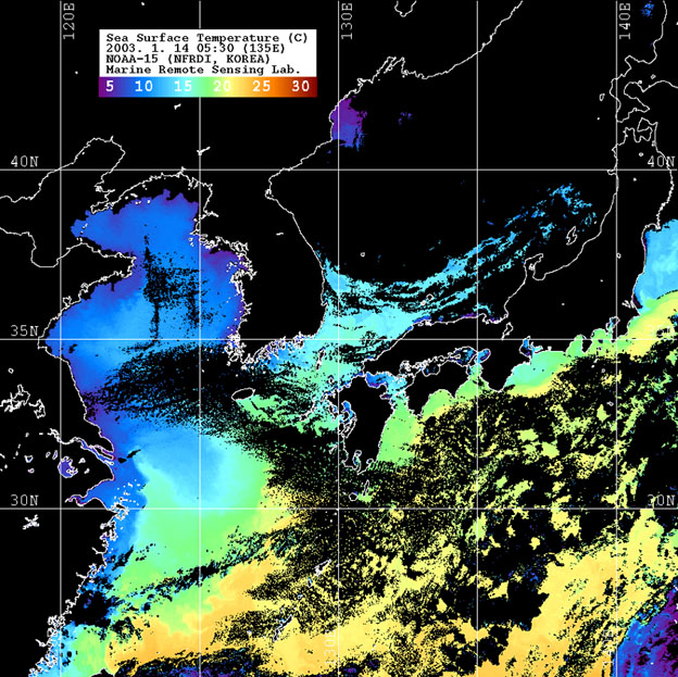 o 2003년 1월 14일 05시 30분 NOAA-15호 위성영상입니다. o 수온분포는 범례를 참고하시기 바랍니다. o 검은색은 구름과 육지를 나타냅니다.