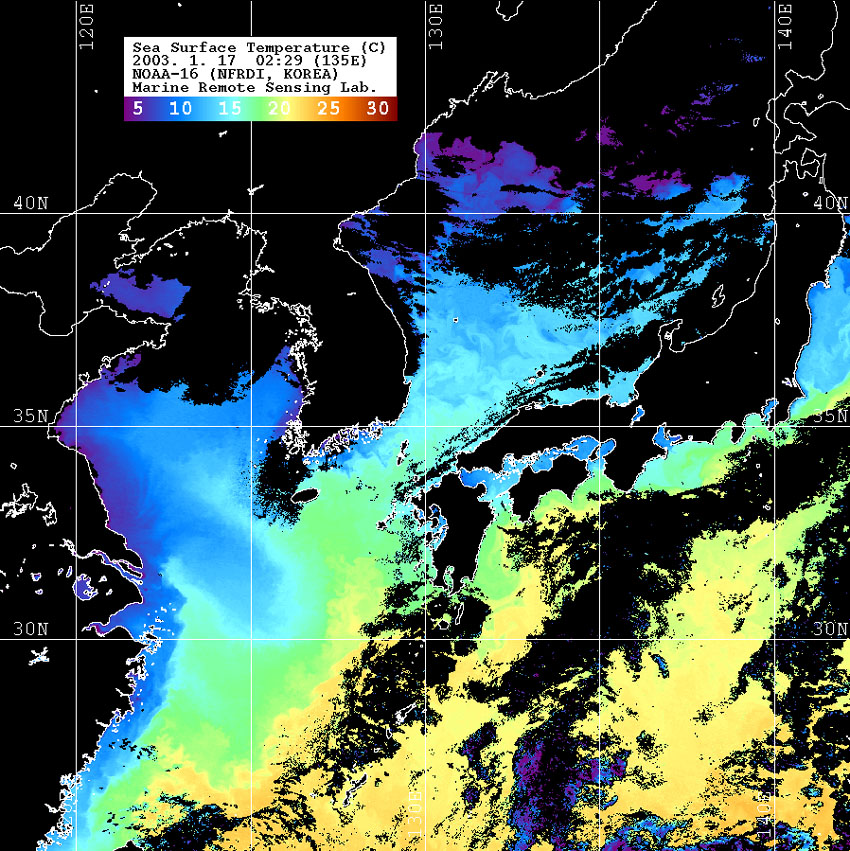 o 2003년 1월 17일 02시 07분 NOAA-16호 위성영상입니다. o 수온분포는 범례를 참고하시기 바랍니다. o 검은색은 구름과 육지를 나타냅니다.