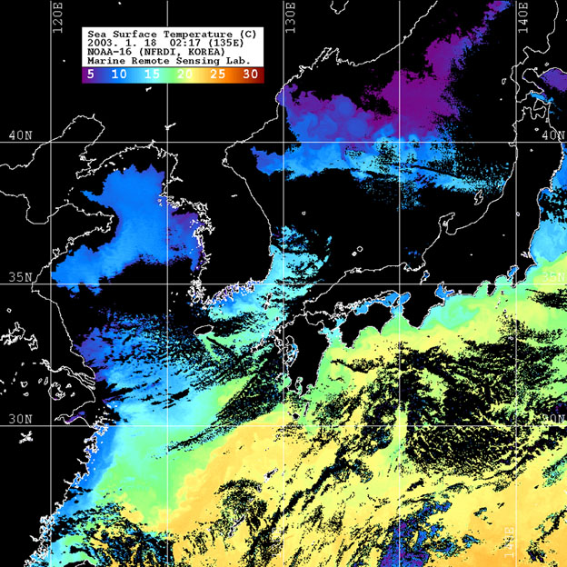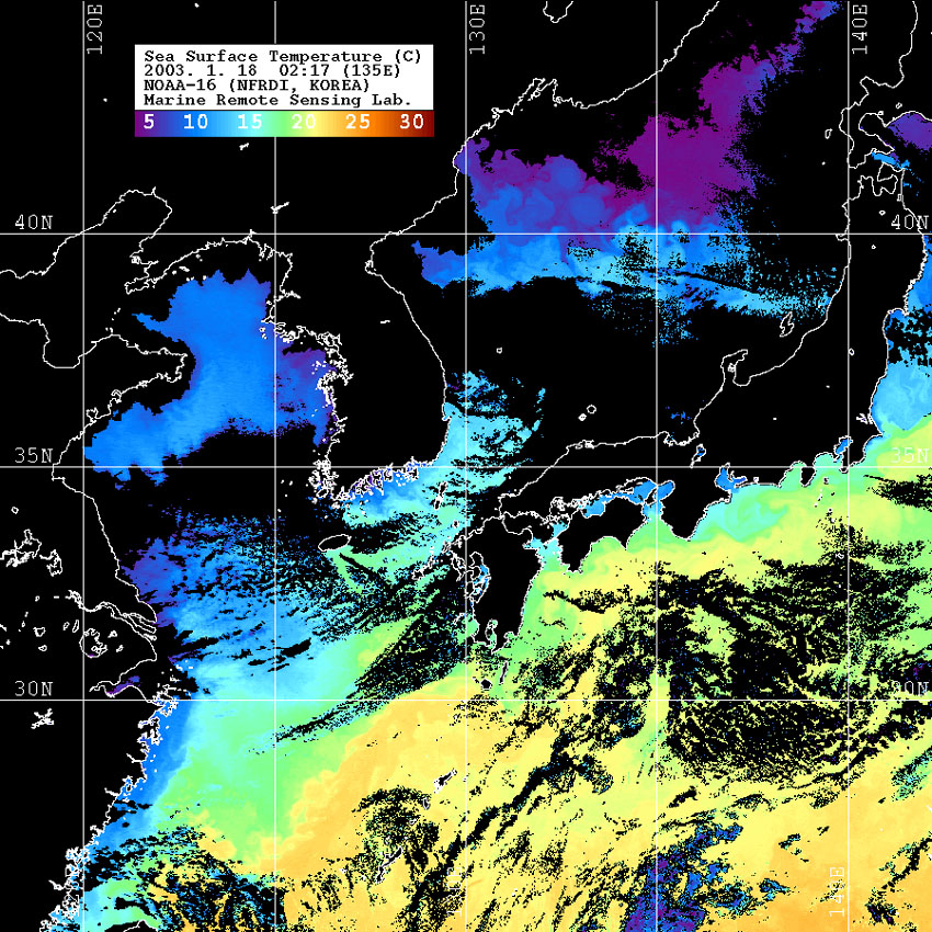 o 2003년 1월 18일 02시 17분 NOAA-16호 위성영상입니다. o 수온분포는 범례를 참고하시기 바랍니다. o 검은색은 구름과 육지를 나타냅니다.