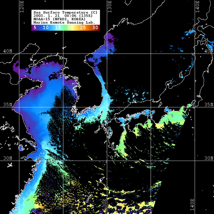 o 2003년 1월 21일 08시 06분 NOAA-15호 위성영상입니다. o 수온분포는 범례를 참고하시기 바랍니다. o 검은색은 구름과 육지를 나타냅니다.