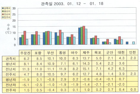 o 최근(2003. 1.12 ∼ 1.18)의 한반도 연안 표면수온은 동해 연안역에서