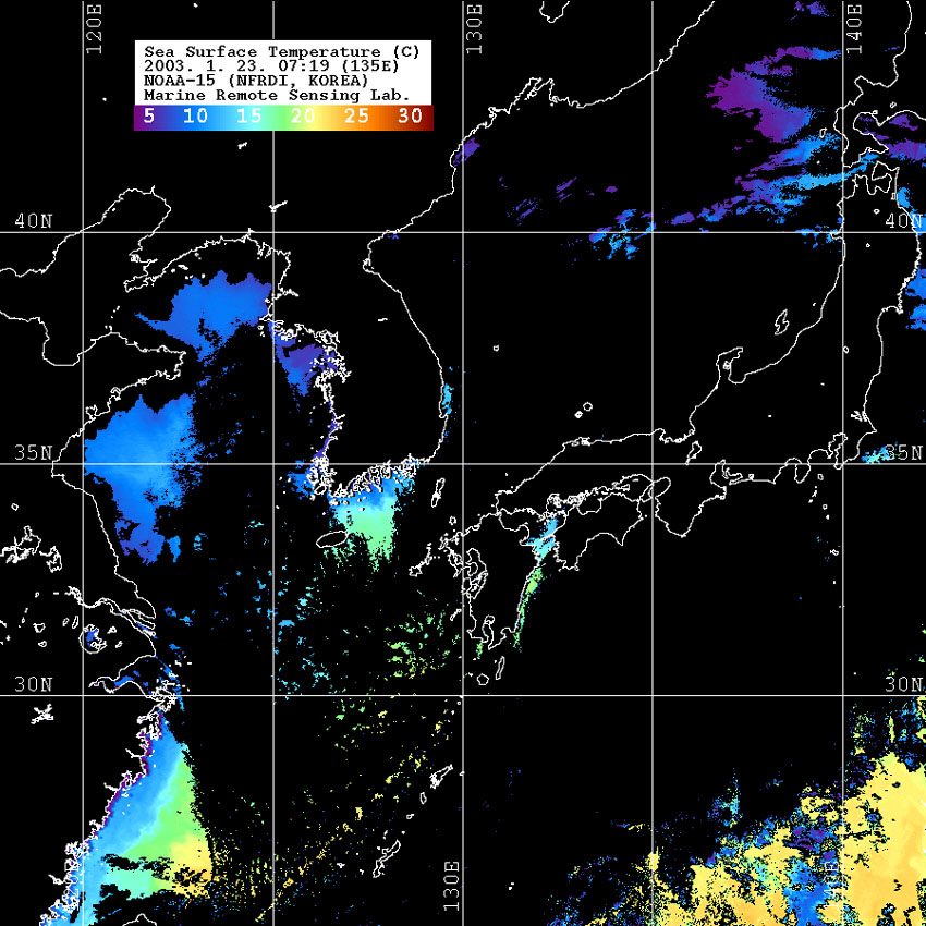 o 2003년 1월 23일 07시 19분 NOAA-15호 위성영상입니다. o 수온분포는 범례를 참고하시기 바랍니다. o 검은색은 구름과 육지를 나타냅니다.