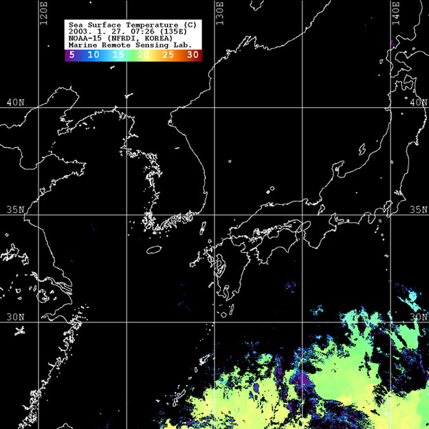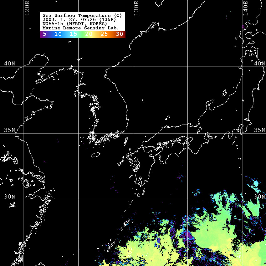 o 2003년 1월 27일 07시 26분 NOAA-15호 위성영상입니다. o 수온분포는 범례를 참고하시기 바랍니다. o 검은색은 구름과 육지를 나타냅니다.