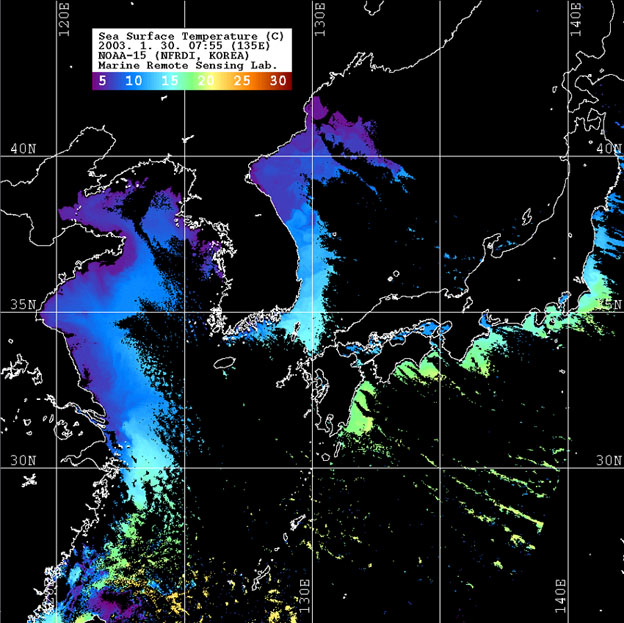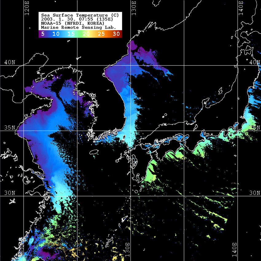o 2003년 1월 30일 07시 55분 NOAA-15호 위성영상입니다. o 수온분포는 범례를 참고하시기 바랍니다. o 검은색은 구름과 육지를 나타냅니다.