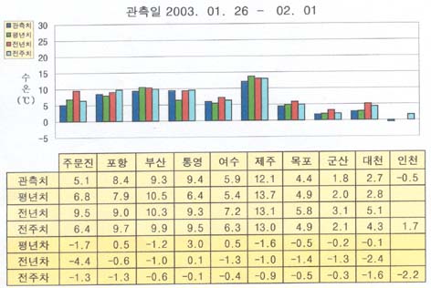 o 최근(2003. 1.26 ∼ 2.1)의 한반도 연안 표면수온은 동해 연안역에서 섭씨