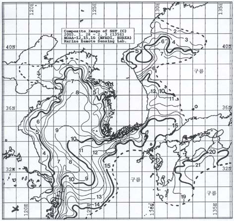 o 수온전선대는 수온 13도를 중심으로 이어도 근해∼제주도 근해∼