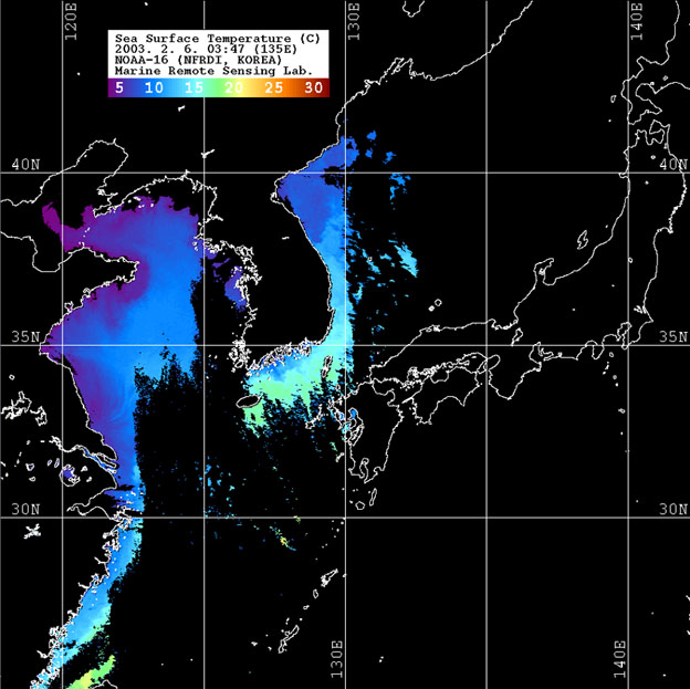 o 2003년 2월 6일 03시 47분 NOAA-16호 위성영상입니다. o 수온분포는 범례를 참고하시기 바랍니다. o 검은색은 구름과 육지를 나타냅니다.