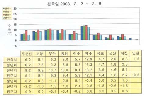 섭씨 6∼8도, 남해 연안역에서 6∼13도, 서해 연안역에서 2∼5도