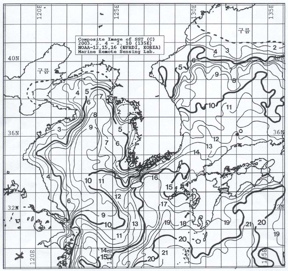 o 아래 그림은 2003년 2월 4일부터 2월 10일 까지 합성한 위성추정 표면 수온분포도입니다. o 대화퇴근해 6∼10도, 울릉도 근해 9∼11도, 대마도 14∼16도, 제주도 근해 13∼16도, 이어도 근해 8∼10도, 일향초 근해 8∼10도, 어청도 근해 4∼5도 내외로 나타납니다. o「평년에 비해」수온은 대화퇴 근해 0.5도 높게, 울릉도 근해 0.5도 낮게, 대마도 근해 0.5도 높게, 제주도근해 0.5도 낮게, 이어도 근해 1.5도 낮게, 일향초 근해 1도 높게, 어청도근해 0.5도 낮게 나타납니다. o 수온전선대는 수온 12도를 중심으로 이어도 근해∼제주도 근해∼부산연안에 걸쳐 형성됩니다. < 위의 그림을 클릭하시면 확대된 수온정보를 보실 수 있습니다 >