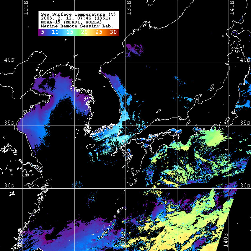 o 2003년 2월 12일 07시 46분 NOAA-15호 위성영상입니다. o 수온분포는 범례를 참고하시기 바랍니다. o 검은색은 구름과 육지를 나타냅니다.