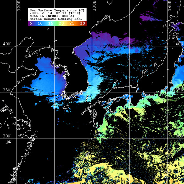o 2003년 2월 14일 02시 17분 NOAA-16호 위성영상입니다. o 수온분포는 범례를 참고하시기 바랍니다. o 검은색은 구름과 육지를 나타냅니다.