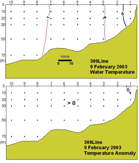 309선(군산 서방)의 수직수온분포도 및 평년편차도 입니다.