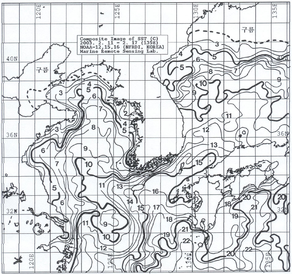 13∼16도, 이어도 근해 9∼11도, 일향초 근해 9∼11도, 어청도 근해 4∼6도
