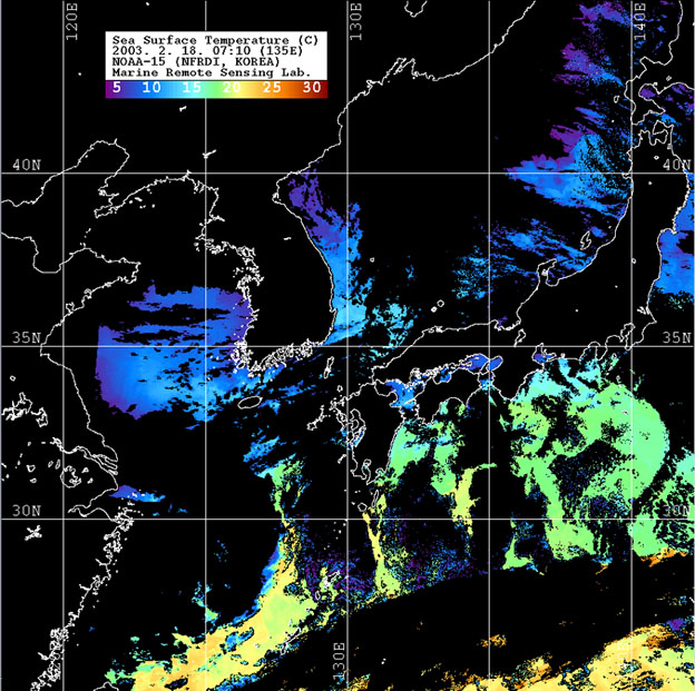 o 2003년 2월 18일 07시 10분 NOAA-15호 위성영상입니다. o 수온분포는 범례를 참고하시기 바랍니다. o 검은색은 구름과 육지를 나타냅니다.