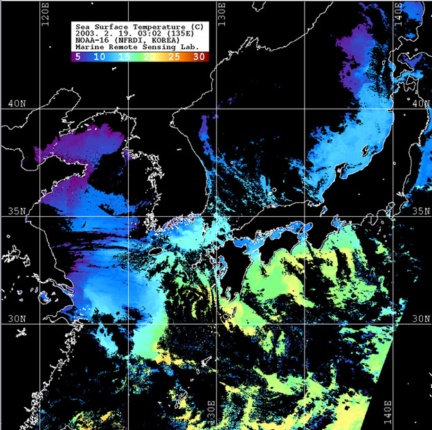 o 2003년 2월 19일 03시 02분 NOAA-16호 위성영상입니다. o 수온분포는 범례를 참고하시기 바랍니다. o 검은색은 구름과 육지를 나타냅니다.