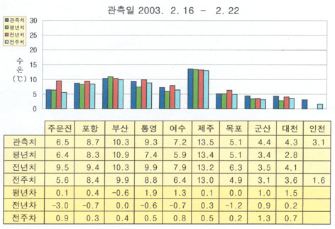o 최근(2003. 2.16 ∼ 2.22)의 한반도 연안 표면수온은 동해 연안역에서 섭씨