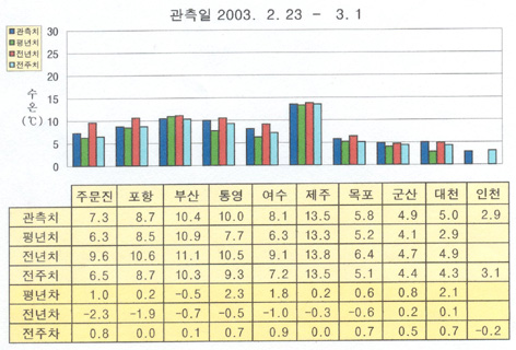 o 최근(2003. 2.23 ∼ 3.1)의 한반도 연안 표면수온은 동해 연안역에서 섭씨