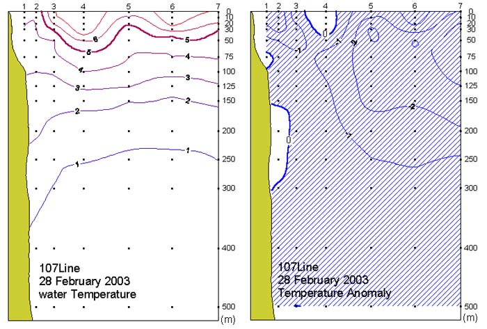 107선(속초 동방)의 수직수온분포도 및 평년편차도 입니다.