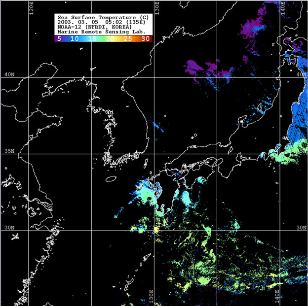 o 2003년 3월 5일 05시 02분 NOAA-12호 위성영상입니다. o 수온분포는 범례를 참고하시기 바랍니다. o 검은색은 구름과 육지를 나타냅니다.