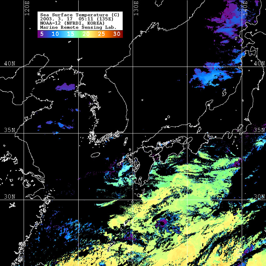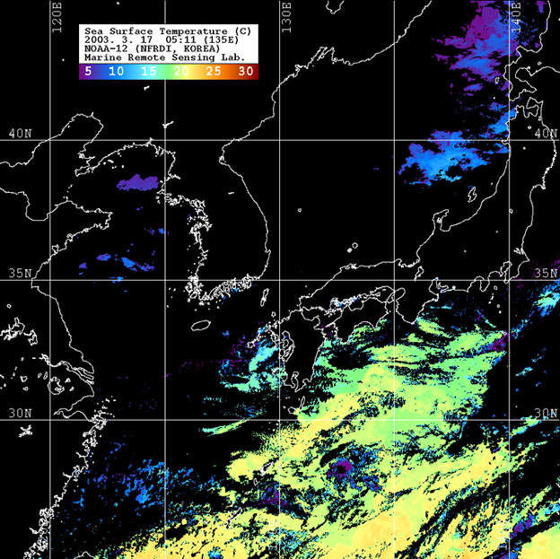 o 2003년 3월 17일 05시 11분 NOAA-12호 위성영상입니다. o 수온분포는 범례를 참고하시기 바랍니다. o 검은색은 구름과 육지를 나타냅니다.