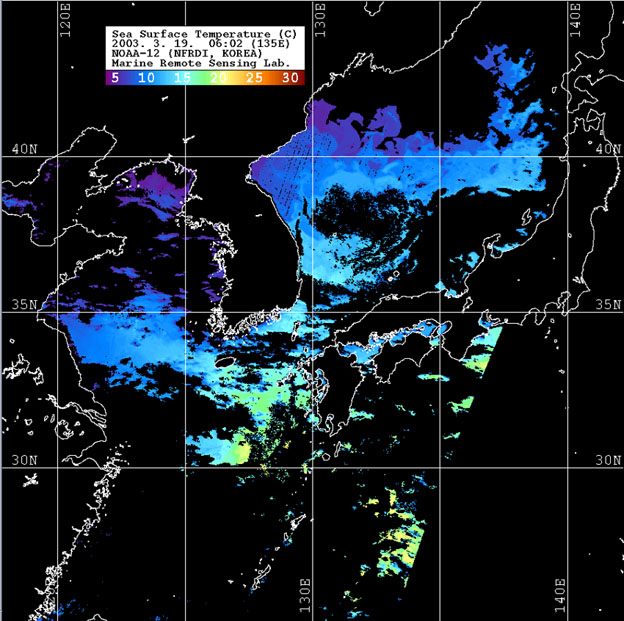 o 2003년 3월 19일 06시 02분 NOAA-12호 위성영상입니다. o 수온분포는 범례를 참고하시기 바랍니다. o 검은색은 구름과 육지를 나타냅니다.