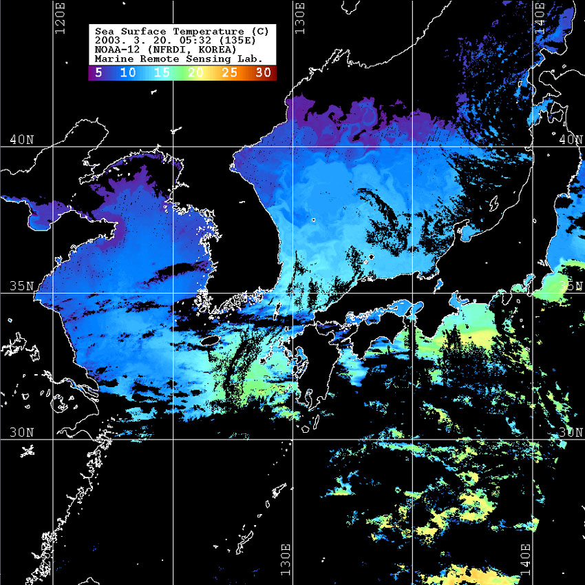 o 2003년 3월 20일 05시 32분 NOAA-12호 위성영상입니다. o 수온분포는 범례를 참고하시기 바랍니다. o 검은색은 구름과 육지를 나타냅니다.