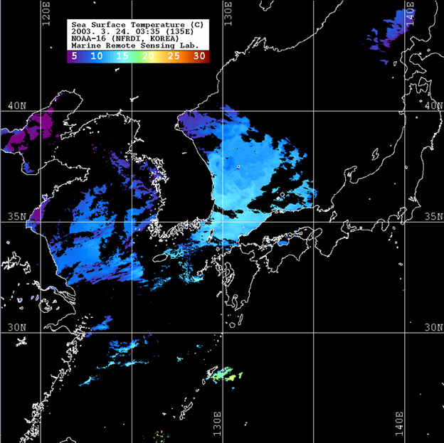 o 2003년 3월 24일 03시 35분 NOAA-16호 위성영상입니다. o 수온분포는 범례를 참고하시기 바랍니다. o 검은색은 구름과 육지를 나타냅니다.