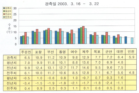 o 전년에 비해 동해 연안은 3도 낮게, 남해 연안은 1.5∼2도 낮게, 서해연안은
