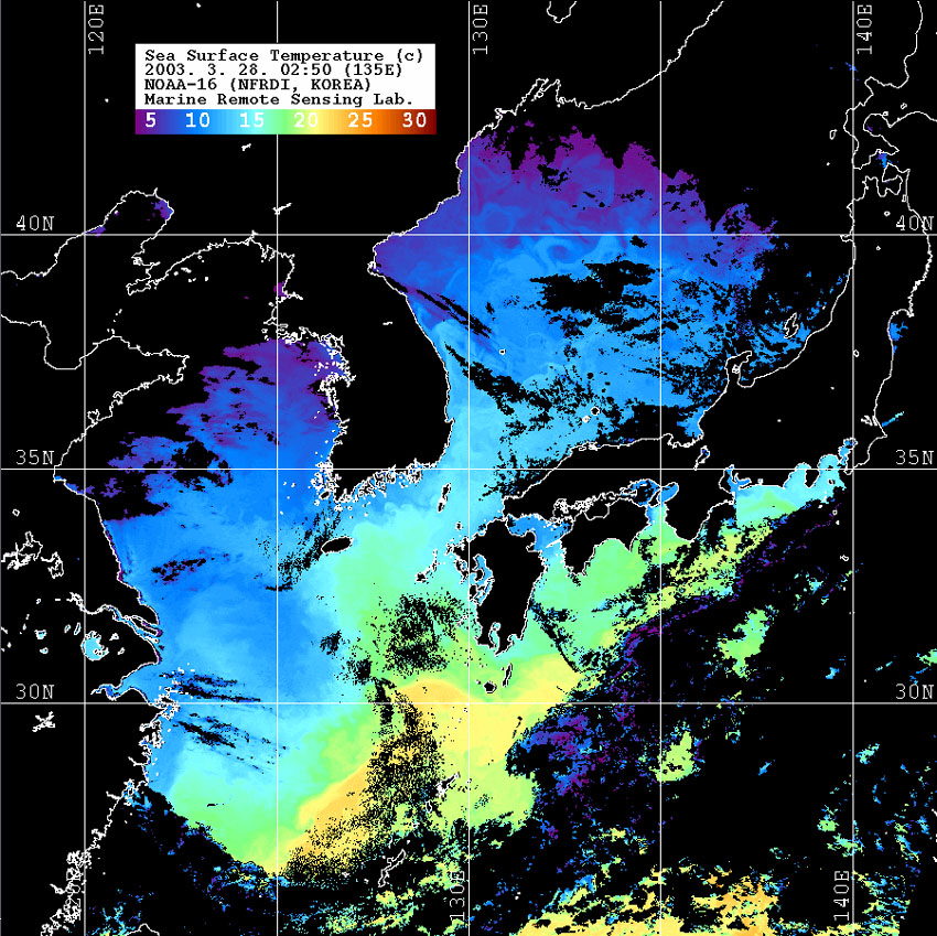 o 2003년 3월 28일 02시 50분 NOAA-16호 위성영상입니다. o 수온분포는 범례를 참고하시기 바랍니다. o 검은색은 구름과 육지를 나타냅니다.