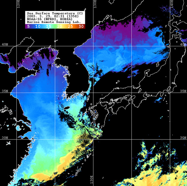 o 2003년 3월 29일 02시 31분 NOAA-16호 위성영상입니다. o 수온분포는 범례를 참고하시기 바랍니다. o 검은색은 구름과 육지를 나타냅니다.