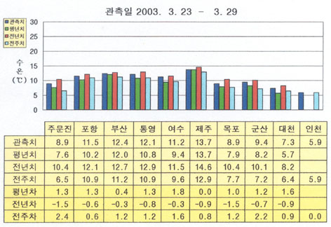 o 최근(2003. 3.23 ∼ 3.29)의 한반도 연안 표면수온은 동해 연안역에서 섭씨