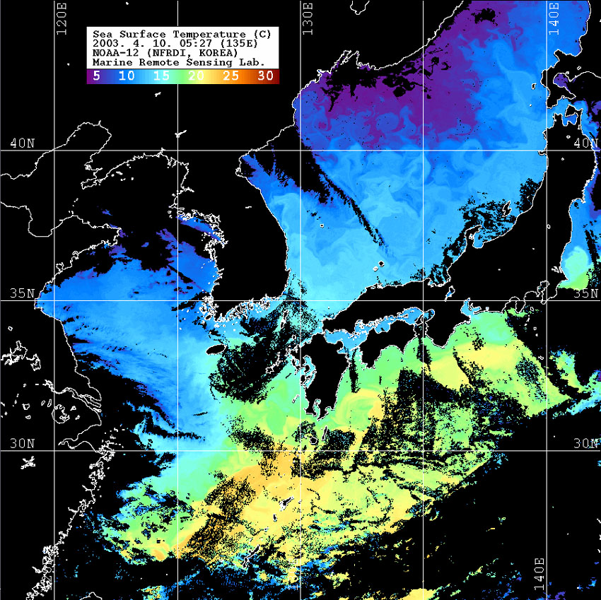 o 2003년 4월 10일 05시 27분 NOAA-12호 위성영상입니다. o 수온분포는 범례를 참고하시기 바랍니다. o 검은색은 구름과 육지를 나타냅니다.