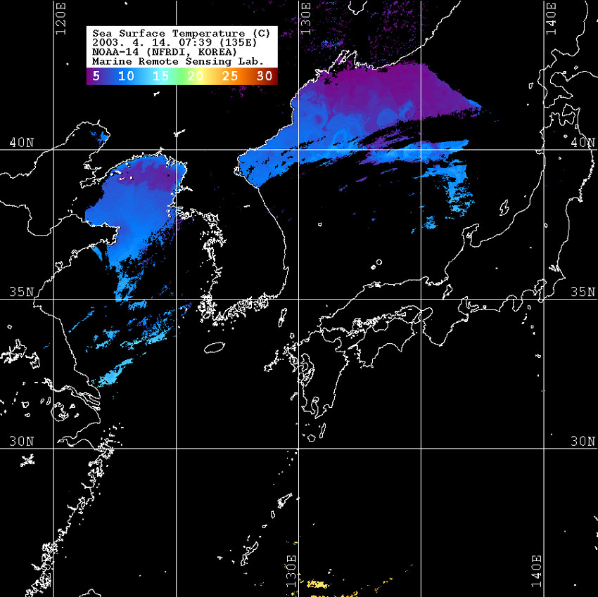 o 2003년 4월 14일 07시 39분 NOAA-14호 위성영상입니다. o 수온분포는 범례를 참고하시기 바랍니다. o 검은색은 구름과 육지를 나타냅니다.
