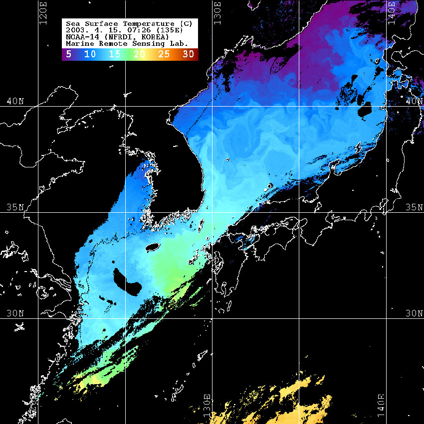 o 2003년 4월 15일 07시 39분 NOAA-14호 위성영상입니다. o 수온분포는 범례를 참고하시기 바랍니다. o 검은색은 구름과 육지를 나타냅니다.