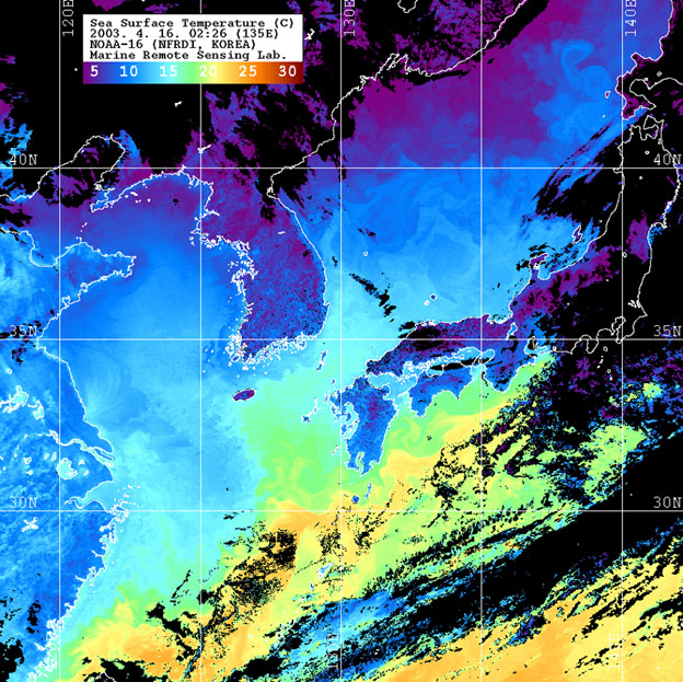 o 2003년 4월 16일 02시 26분 NOAA-16호 위성영상입니다. o 수온분포는 범례를 참고하시기 바랍니다. o 검은색은 구름과 육지를 나타냅니다.