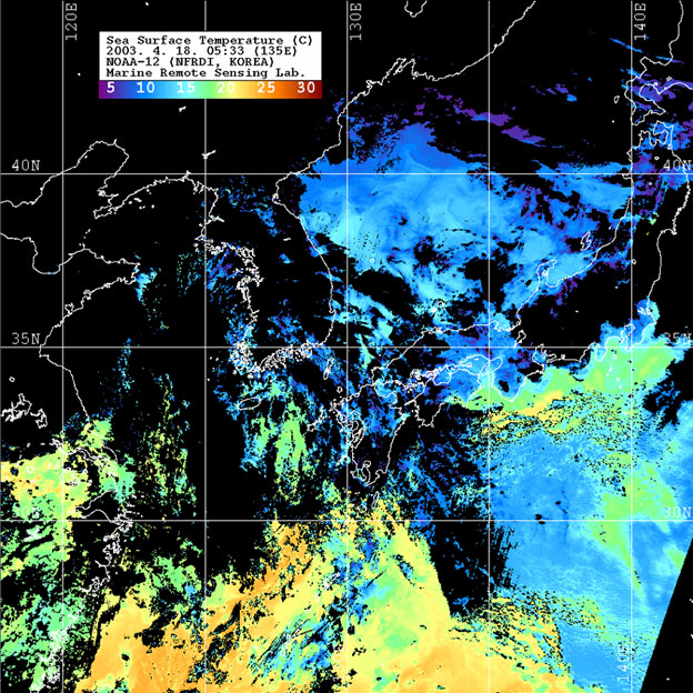 o 2003년 4월 18일 05시 30분 NOAA-12호 위성영상입니다. o 수온분포는 범례를 참고하시기 바랍니다. o 검은색은 구름과 육지를 나타냅니다.